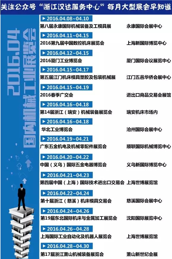 國內(nèi)機(jī)械展會(huì)還有遺漏的,在評(píng)論里告訴小編。4月份的展會(huì),你們有到機(jī)械展會(huì)現(xiàn)場(chǎng)的,也發(fā)照片秀給“zjhandaservice”看。