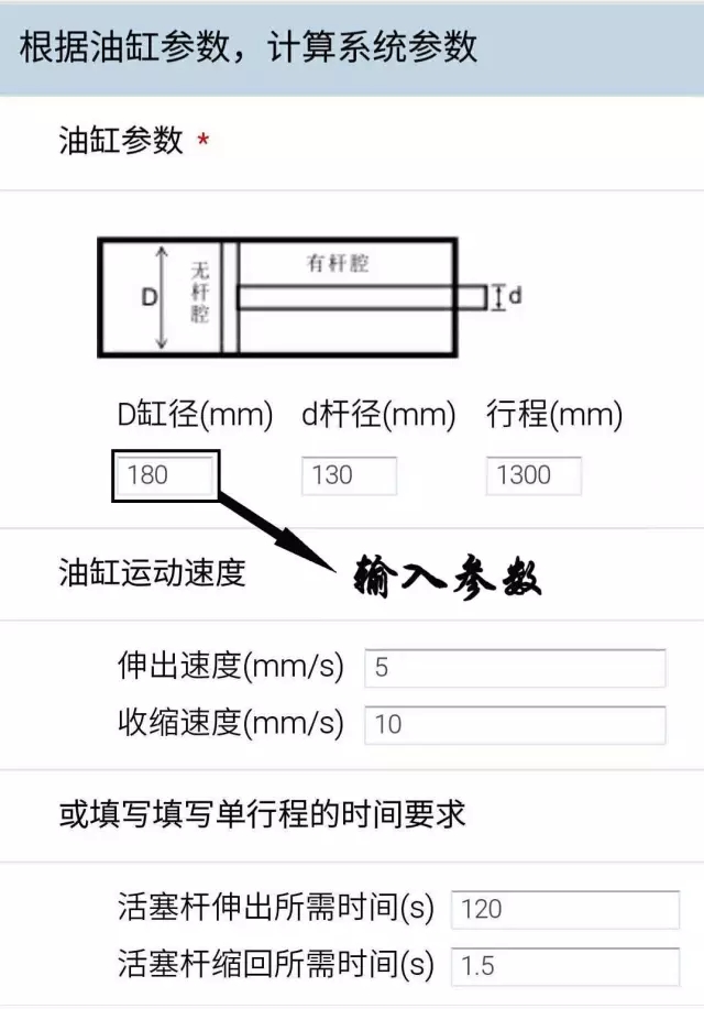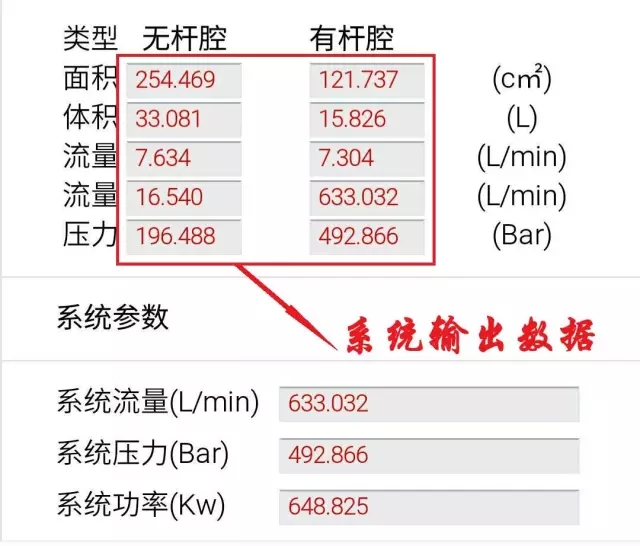 在液壓系統計算器里,輸入油缸的基本參數,計算器自動輸出液壓系統流量、壓力、功率。 “黑色的”為您需要輸入的數據,“紅色的”為系統自動計算的數據。